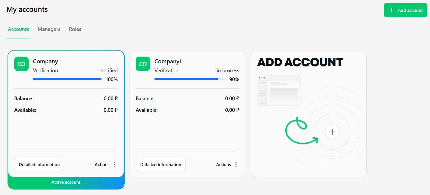 Account — an independent profile with its own balance, contract, tasks, performers, documents, and finances. It can represent a separate company, project, or department.