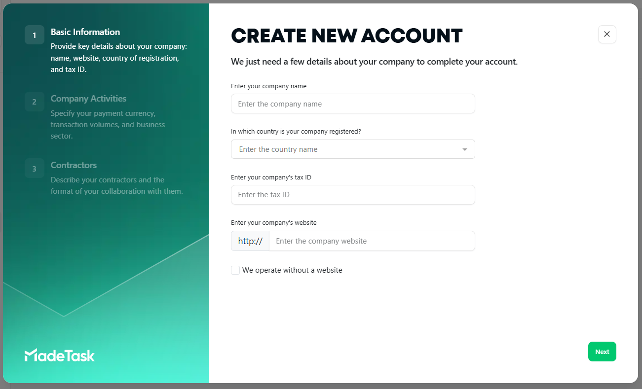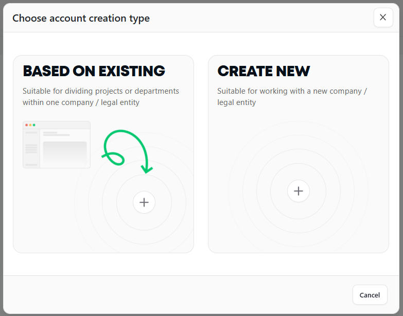 - Based on an existing account — allows reusing a company account that has already passed KYB verification, so no additional verification is required.