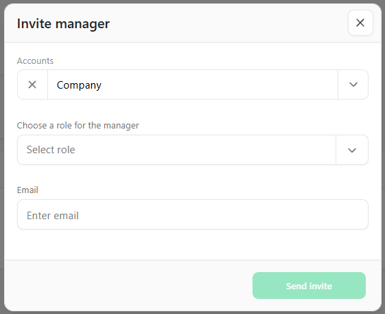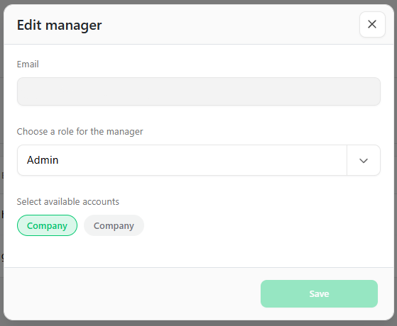 Managers exist at the dashboard level but can be assigned to specific accounts via access settings.