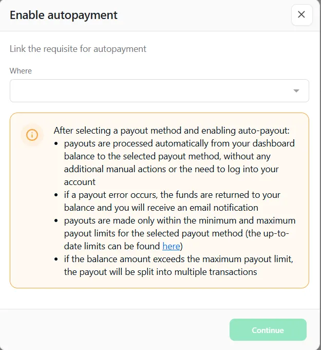 - If the balance exceeds the maximum limit, the payout amount will be automatically split into multiple transactions until the full balance is paid out.